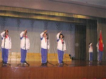 会议由董晨光、王苇婧、李知南、肖红同学主持,伴随着鼓号声,少先队队旗在全年级少先队员庄严的敬礼下来到会场中央。随后陈桂芬副主任任命并宣布各中队辅导员老师以及各中队和联合中队的中队委名单,并向各中队授中队旗。各中队向到场领导与辅导员老师献上鲜艳的红领巾,表达了同学们对老师的感谢与敬意。