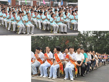教师(左上)、学生、家长(右)代表分别发言 参加开学典礼的同学们