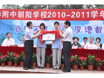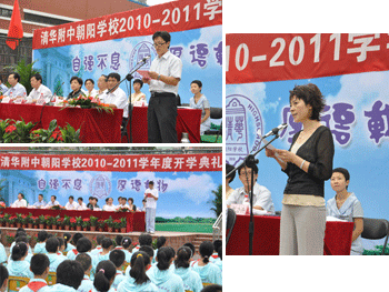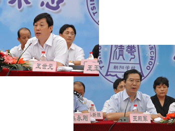 王殿军校长和朝阳教委副书记王世元为朝阳学校揭牌 王世元副书记(左上)和王殿军校长分别讲话