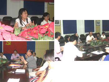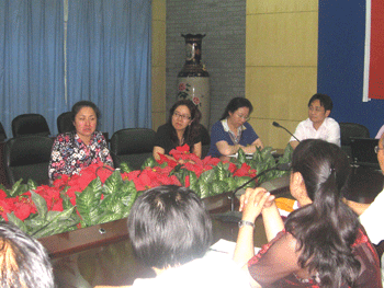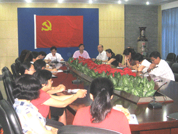 朱建宏同志(正面左)汇报自己的情况 党委书记方妍(正面左1)发言