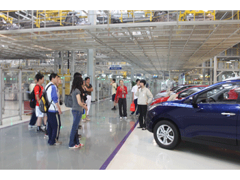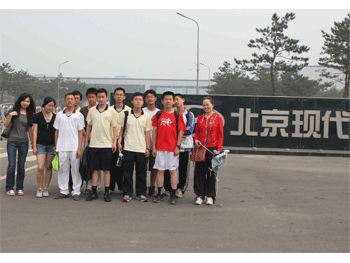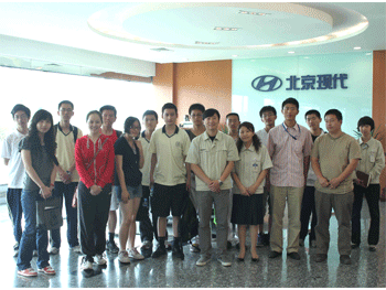 北京现代汽车厂专门安排接待人员,为同学们介绍了现代汽车的发展历史和生产情况,观看了企业宣传片;参观了新型车展,参观了整车组装生产流水线。进入整洁的厂房,车间大得一眼望不到头,全部自动化的流水线作业,由机械和人工共同完成。整个车间是“零”库存,生产厂绝对不会积压配件库存,为了保证流水线不停工,配件提供商要严格按照既定程序将配件送到指定的地方。