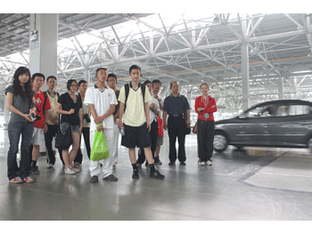 师生们在现代汽车公司内留影 师生们听现代汽车公司接待人员讲解