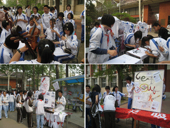 大团会后的支部特色展示活动以“迎附中校庆,展青春风采”为主题,旨在通过各班的活动展现校园文化,体现支部特色。各支部的展示活动丰富多彩,各具特色。“校史知识有奖问答” 大家一起回顾校史;“校服猜猜猜”展示了不同时期的附中校服,讲述了校服的文化内涵;有的支部还设计了带有不同图案的校庆纪念章,受到大家好评;有的支部摆起了“涂鸦青春”现场T-恤制作的展台;还有四人小合奏、书画展示、“校园寻宝”等活动。此外,书市和社团文化展示、“拒吸第一支烟”签名、“废纸换新本”等活动也吸引着大家的关注和参与。