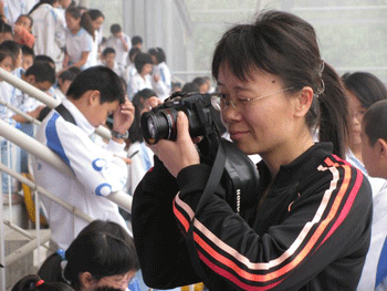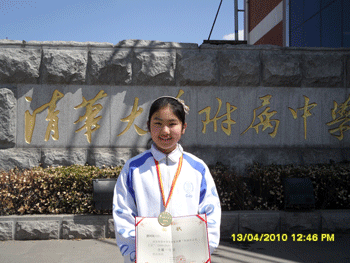 载誉归来的刘珂昕同学在校门前留影 指导教师叶春芳老师