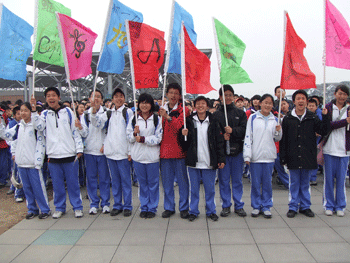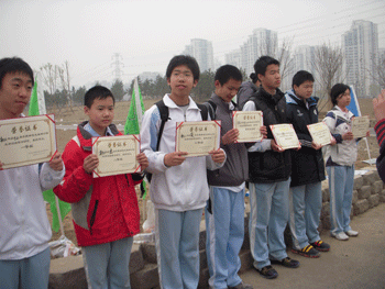 本次活动安排在奥林匹克森林公园,要求学生不带水和食物,以生存训练为主题。在侦查小组的带领下,每8—10名学生为一组活动,每人手中一份地图,按照地图上的标记和自己手中带GPS模式的手机定位地理坐标,寻找生存营地点。在寻找食物的同时,展开竞技比赛“拔军旗”,通过团队的合作,学生们在规定的时间内取得军旗和生存食品券,前往大本营会和,并领取食品。在大本营,学生们把亲手绘制的班旗插在指定位置,并把代表胜利成果的军旗一一摆放其后。