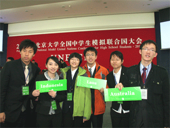 3月18~21日,第六届北京大学全国高中生模拟联合国大会(PKUNMUN)在北大英杰会议中心隆重举行。bg真人娱乐派出10位学生(高0802班关海英,高0804班张圣林,高0805班朱正人,高0806班尹航,高0807班孟梦,高0903班笪颢天,高0907班刘若水、薄文枚、王天锐,高0908班陈楚岩)参加,分别代表老挝和阿塞拜疆,与全国近百所顶尖中学代表进行交流、磋商。此外高0808班郑岸青同学创意并制作了bg真人娱乐在本次模联大会上展出的“地球村”。本次模联协会的活动得到了学校办公室、教务处、德育处等相关部门的悉心相助以及英语教研组、高一、高二年级组的大力支持。