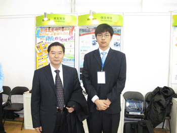 左起:王殿军校长、市教委副主任郑萼、副市长黄卫、承旭 王殿军校长与承旭同学在展台前合影