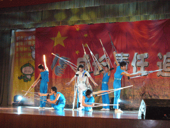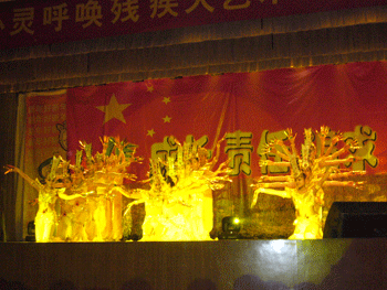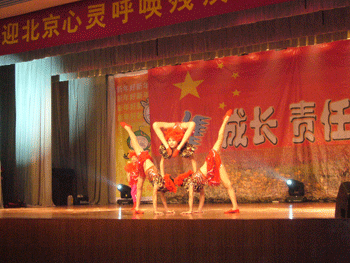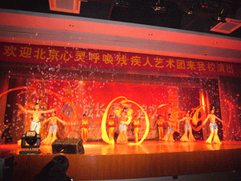听力障碍演员们表演的《飞天》鼓声轻快、轻舞飞扬,把师生们带到了千里之外的莫高窟;曾在国际比赛中荣获金奖的杂技表演《美人鱼》惊心动魄、精彩绝伦。盲人艺术家用锯演奏的《万水千山总是情》让人如醉如痴,惟妙惟肖的模仿更是获得了阵阵掌声;现代风情舞蹈《金色阿拉伯》华丽柔美,充满异域风情;川剧《变脸》精妙神奇;经典舞蹈《千手观音》释放人间大爱、捧出人间真情。郝开老师自费奔赴四川灾区开个人红歌演唱会回报社会的行为感动了大家,用左手提字“珍惜时光”,激励了大家。最后在美丽的歌声《隐形的翅膀》中,师生们和这些自强不息、顽强不屈的演员们挥手告别。