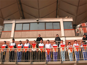 bg真人试玩校长王殿军(正面右1)做工作汇报 督导专家组全体督评人员观看升旗仪式