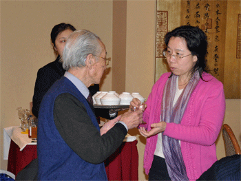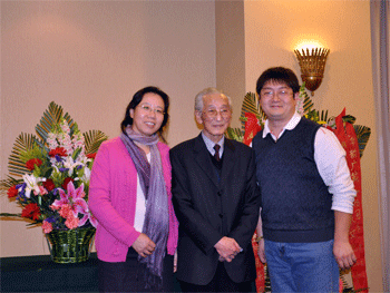 杜毓贞(左)、胡军(右)在我校民乐团敬献的花篮前与朴东升先生合影 杜毓贞副校长(右)与朴东升先生交谈