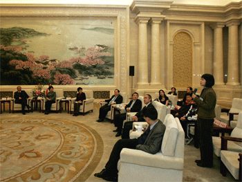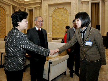 陈至立副委员长与卢胜寒(右)握手 卢胜寒(左2)与杜毓贞副校长(左1)、 指导教师合影