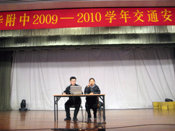 初09年级组长(右)向同学们介绍黄警官 黄警官给同学们做交通安全报告