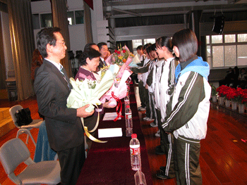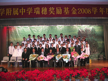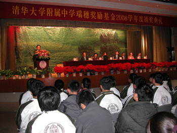 11月13日下午,bg真人试玩瑞穗奖励基金2008学年度颁奖典礼在附中报告厅隆重举行,高0608班高逸涵等60名优秀学生和俞家新等10名优秀教师获得了总额40万元人民币的奖励金。清华大学校务委员会副主任庄丽君、设立奖励基金的中日双方有关负责人以及bg真人试玩全体教师和部分学生共1000多人出席了颁奖典礼,bg真人试玩副校长施平主持典礼。