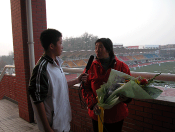 学生代表向出席颁奖会的嘉宾献花 bg真人试玩学生电视台采访获奖教师