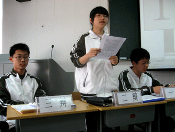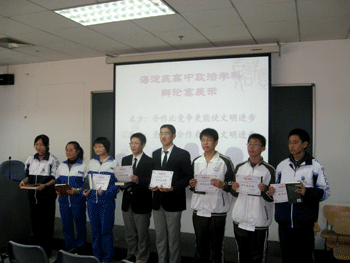 11月16日,bg真人娱乐高09级3班吴玉潇、7班薄文枚、8班陈江辉同学代表学校参加2009年度北京市政治学科辩论赛海淀分赛区的比赛,通过与101中学进行“竞争与合作谁更能推进文明”的辩论,最终薄文枚同学被评为“优秀辩手”,吴玉潇同学被评为“最佳风采”、陈江辉同学被评为“最佳口才”。