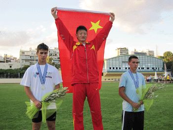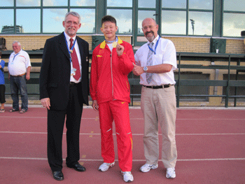 武陈燚同学(中)在冠军领奖台上 武陈燚同学(中)与国际田联官员合影