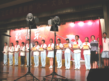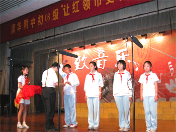 周兆玉副书记宣读了初08级优秀集体和优秀个人的表彰决定:初0805中队、初0809中队、初08010中队和初0811中队获得“优秀中队”称号;张伟宣等12名同学被评为“优秀中队干部”;黄圳峰等60名同学被评为“优秀少先队员”;杜乐怡等156名同学被评为学习、纪律、文艺、体育和文明等单项标兵。王殿军校长和方妍书记为他们颁发了获奖证书。