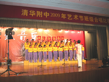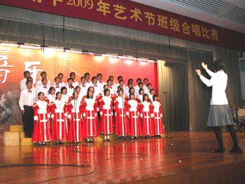 本次合唱比赛由附中艺术中心主办,第一场由高一年级组以及外语教研组联合推出,以中英文两首曲目展示各班风采。在第二场和第三场比赛中,初一、初二的小同学们也以两首中文歌曲,穿插朗诵竞相展示各班风采。今年恰逢我们伟大的祖国建国60周年,《我和我的祖国》、《长江之歌》、《北京欢迎你》、《彩色的中国》等歌曲,饱含对地震灾区同胞们的深切关爱和对祖国母亲的热情赞颂。“中国加油”振奋着在座的每一位师生。烛光、彩带、舞步、乐队,诗歌和着青春的旋律诠释着bg真人娱乐师生的灵感与激情。此外,高二年级王上同学为学弟学妹们表演了男声独唱《天边》,校合唱团的师生们也以精彩的演出为合唱节助兴。