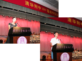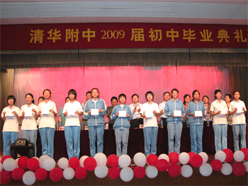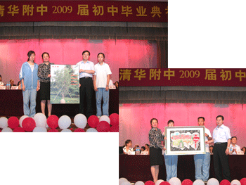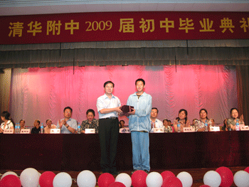 毕业典礼由教务处副主任朱培主持,全体校领导和初三任课教师在主席台上就坐。王殿军校长首先致辞,祝贺同学们顺利毕业,并表达了对他们的殷切希望。随后,刘俊副校长宣读了三好学生、优秀学生干部、优秀班集体的表彰名单,方妍书记宣读了2008—2009学年度学科、科技、体育竞赛获奖学生名单;出席毕业典礼的领导为获奖学生颁奖。教师代表汤莉在发言中对同学们表示了衷心的祝福和美好的祝愿;初0611班朱翼先同学代表全体毕业生发言,表达莘莘学子对母校的感激之情。最后,同学们向母校赠送了一棵毕业感恩树,以“昔我往矣,海棠依依。今我来思,桃李累累”表达他们对母校的依恋之情。初0610美术特长班集体创作了一幅感谢母校的作品献给学校。