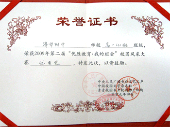 4月28日下午,2009年第二届“优胜教育·我的班会”校园风采大赛颁奖典礼在东城区北京二中分校举行,bg真人试玩高0803班(班主任寇晓东)的主题班会《三鹿大事件,三班小课堂》及其海报作品荣获优秀奖。来自北京市近300所中小学校的600多个班级参加了本届大赛。