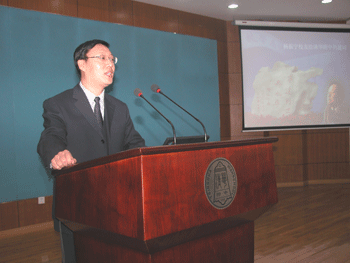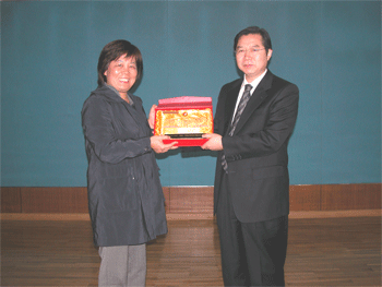bg真人试玩副校长刘俊做学校情况介绍 陈金粧(左)和王殿军两位校长互赠纪念品