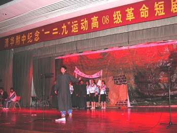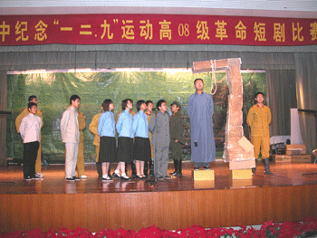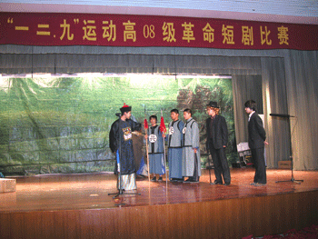 这次由高一年级(高08级)各班自导自演的革命短剧比赛的剧目,充分体现了当代学子心中荡漾的民族之情。8班的《虎门销烟》演绎了林则徐不畏列强的凛然正气。2班的《李大钊》表现了共产党员身在刑场毫不畏惧,誓为共产主义献身的精神。4班的《干粮袋》讲述了在长征途中,一位老班长把生的机会给了年轻战士的故事,在悲壮哀婉的音乐声中,全体观众为之动容。6班的《巨浪》再现了“一二·九”运动的场景,青年学子走上街头,振臂高呼,让衰颓的社会再次热血沸腾。7班的《英雄王二小》表现了少年英雄王二小不畏强敌,英勇献身的事迹。1班的《英雄叶挺》让观众在记住叶挺将军赫赫功名的同时,也记住了他坚韧不屈、至死不渝的精神。在5班的《红岩魂》中,渣滓洞阴森黑暗,但是共产党员唱着国歌,绣着红旗,让共产主义精神在牢狱中依然闪亮。3班的《任长霞》,面对狡诈阴险的牛东愤然斥之,而对于百姓则鞠躬尽瘁,最终在车祸中因公殉职,让人看到了这位当代英雄谱写的一曲慷慨悲歌。最后,伴着点点烛光, 10班同学朗诵了纪念改革开放三十周年的长诗《成长在中国》。
