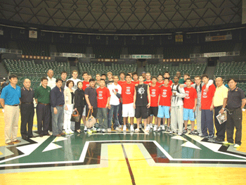 bg真人娱乐男篮队员与当地知名华人黄瑞(前左4)合影 比赛中