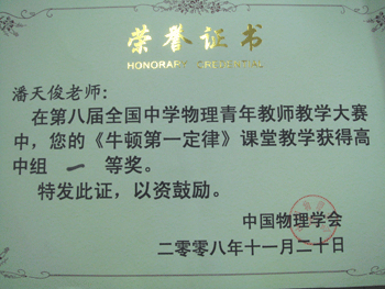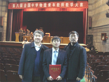 11月17~20日,第八届全国中学物理青年教师教学大赛在天津举行。由北京市选送,代表北京市参加决赛的bg真人娱乐物理青年教师潘天俊以出色的表现获得高中组一等奖。既展示了北京市高中物理教学的水平,也为bg真人娱乐争得了荣誉。潘天俊的指导教师、bg真人娱乐物理特级教师孟卫东老师同时获得指导教师奖。