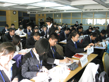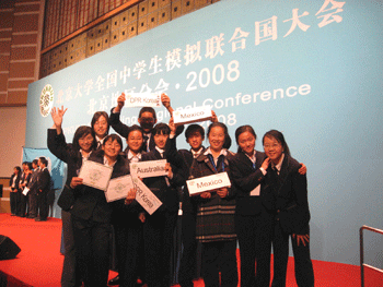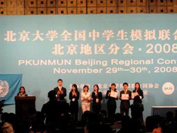 11月29~30日,2008年度北京大学北京地区高中生模拟联合国大会在北京大学英杰会议中心隆重举行。作为本次会议的北京34所示范中学之一,bg真人娱乐应邀派代表参加。在刘俊副校长以及程惠云、陈彦竹、谢慧艳、金云等老师的悉心指导下,bg真人娱乐高0703班宋思嘉、陈天赐,高0704班蒋若然、杨小诗,高0707班孙经娜、李金雪、饶麦齐,高0803班陈竹君,高0705班朱正人,高0708班关海英同学组成朝鲜、墨西哥、澳大利亚代表队,分别在“安理会”、“开发计划署”、“经社理事会”、“联合国高级难民署”完成自己的“外交使命”。此外高07级的李子夷、陈吉阳、孙狄龙、张鑫怡,高08级的朱静伊、李丁唯、禚越、张圣林、何子彧等同学也为大会做出了贡献。最终,孙经娜同学获得了委员会“最佳代表”的荣誉。