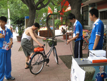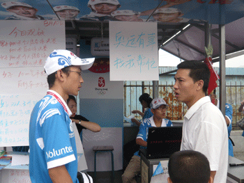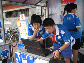 城市志愿者的工作不像奥运志愿者那样复杂,主要就是为路人提供一些信息咨询和翻译等服务。为了工作需要,学校为服务站配有一台笔记本电脑和一本北京交通路线图,以便于查询。每当有路人过来看展板时,同学们都会主动向他们讲解,如当天赛程,夺金点等。面对路人的问题,也会全力解答,或用最快的速度查询,努力争取给出让路人满意的答复。