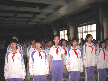 大会在嘹亮的出旗曲声中拉开序幕。德育处副主任陈桂芬宣读初07级优秀集体和优秀个人的表彰名单:初0703中队、初0704中队、初0705中队和初0712中队获得优秀中队称号;曲雪琪同学被评为初一联合中队优秀干部;宋宇辰等12名同学被评为优秀中队干部;彭天健等63名同学被评为优秀少先队员;伍宁等121名同学被评为单项标兵。刘俊副校长在致辞中,首先祝同学们节日快乐,并表扬和肯定了同学们在过去的一年里良好表现,及在汶川地震后抗震救灾、奉献爱心活动中的积极热情,最后勉励同学们要珍惜幸福生活,刻苦努力学习,做国家的栋梁之材。初0704中队的陈希比同学代表优秀少先队员发言,表示要铭记师长嘱托,不愧为少先队员的光荣称号。大会还设计了为辅导员老师献礼的活动,在“写给妈妈的信”的乐曲声中,各个中队的代表满怀深情地表达少先队员们对辅导员老师们的感谢、问候与祝福,并送上精心准备的礼物,场面十分的感人,许多同学和老师都激动地留下了热泪。对学生进行了一次很好的感恩教育,也促进了师生情谊。最后全场起立高唱少先队队歌,大会圆满结束。