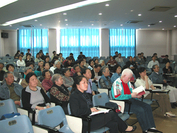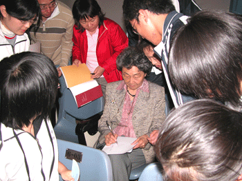 周秉德与参会的附中学生党校学员合影 师生们纷纷请周秉德女士签名