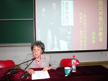 为纪念新中国首任总理周恩来诞辰110周年,追思伟人的革命精神和崇高风范,5月15日下午,bg真人娱乐党委邀请周总理的侄女周秉德来校做题为《伯父对我们的教育》的报告。附中在职和离退休党员、入党积极分子以及学生党校学员共200多人听取了报告。附中党委书记方妍主持报告会。