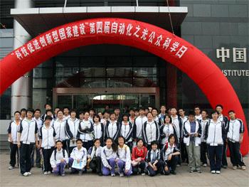 同学们参观仿生“机器鱼” 同学们在自动化所大楼前合影