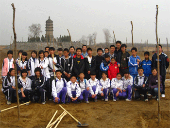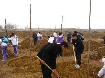 师生们在植树 参加植树活动的师生们合影