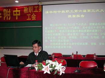 1月16日至24日,bg真人娱乐第七届教职工代表大会暨工会会员大会胜利召开。清华大学工会常务副主席向波涛应邀出席了1月16日的开幕式并致开幕辞。开幕式上,附中校长王殿军向大会做2007年学校工作报告;附中党委副书记、上届工会主席周兆玉做工会工作报告;教代会提案委员会主席莫振伟老师向大会做了上届教代会提案和意见的答复报告。