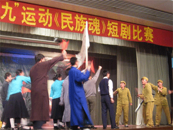 凭栏处仰天长啸,壮怀激烈欲将贺兰踏破,到头来,空悲切。岳母刺字,精忠报国,一班的同学们再现岳家军的风姿,不减当年。虎门滩外鸦片尽毁,滚滚浓烟直上云霄,中华儿女屹立不倒。三班同学们再度诠释的民族英雄林则徐,刚正之气,一如当初。十班同学演出的李大钊,不惜撒遍热血抛头颅,毅然将共产主义的火种播撒在九州大地。长征途中,血与泪的交融,生与死的考验,四班同学带来了“金色的鱼钩”这一经久不息的感人故事。在日寇铁蹄的践踏下,中国青年终于起身反抗,轰轰烈烈的一二九运动就此推向高潮,八班的同学们再现了当年中国学子们的沸腾热血,斗志昂扬。自古英雄出少年,在全民抗日的那时,王二小的事迹被六班同学栩栩如生的再现,放牛郎的歌声,至今萦绕。五班同学出演的铁将军叶挺,让人不得不铭记这位常胜将军的过人胆识以及至死不渝的坚定不屈。在革命的曙光就要来临的时候,渣滓洞中依然黑暗重重,江姐的共产党员意志和白梅弃暗投明的震撼,正是七班同学演绎出的红岩之魂。历史演变至今,仍然在平凡中感动着我们。二班同学用他们的表演向我们讲述了一名普通的乡村教师,用生命去关怀一群山区孩子们的事迹。此次短剧完全以历史的时间进程为主线,赞颂和讴歌了那激励着一代又一代炎黄子孙的在逆境中永不言弃、傲然屹立的中华民族伟大的民族魂。第三篇章,配乐诗朗诵《祝福祖国》震撼人心,对主题进一步升华。伴着主持人深情的朗诵,展现在观众面前的是一张张振奋人心的图片:青藏铁路、三峡大坝、香港回归、抗击非典、申奥成功、十七大等等,把观众一同引入了现在崭新灿烂的时代,一同为改革开放的伟大成果而骄傲!