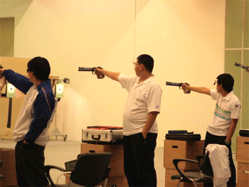 男子气手枪季军赵晟华(中)在比赛中 男子气手枪青年组团体冠军郭旭凯(左)、赵晟骅(中)