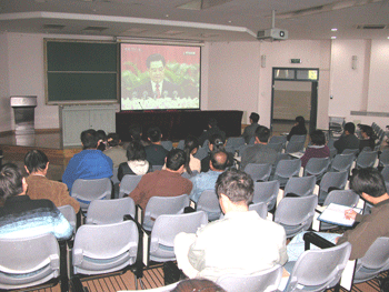 10月15日上午,bg真人试玩党委组织党员、入党积极分子及部分群众在综合楼B座208大阶梯教室收看了中国共产党第十七次全国代表大会的开幕式现场直播,聆听了胡锦涛总书记所作的题为《高举中国特色社会主义伟大旗帜,为夺取全面建设小康社会新胜利而奋斗》的报告。许多有课的老师在上课前或下课后也都赶来收看,部分工作离不开的人员还通过网络电视进行了收看。