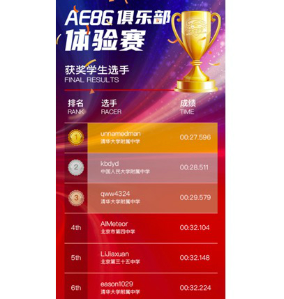 AE86俱乐部体验赛前8名获奖学生选手