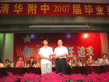 会上周兆玉副书记宣布了表彰名单,方妍书记宣布了学科竞赛获奖者名单,出席典礼的领导们为“万邦儒奖学金”获得者、“希望之星”获得者、北京市“三好学生”、优秀学生干部、校级优秀班集体等获奖个人和集体颁奖。王殿军校长还为初三各班的代表颁发了该班的毕业证书,并一一和他们合影留念。