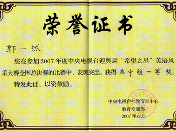 月9日至21日,第8届CCTV“希望之星”英语风采大赛全国总决赛在北京举行。bg真人娱乐高0607班郭一然同学代表北京队参赛,获得全国总决赛亚军,高0507班彭晨同学获得北京赛区三等奖,高0605班杨李乐同学获得北京赛区优胜奖。