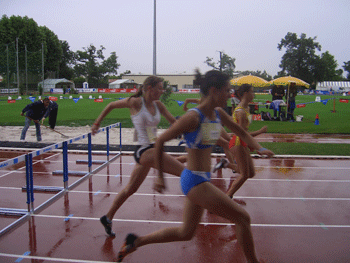 谢婷婷同学(领先者)在女子100米比赛中 何嘉同学(左一跑道)在女子100米栏比赛中