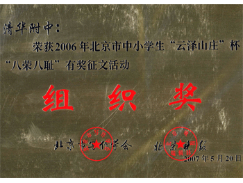 5月20日,由北京市写作协会主办,《北京日报》协办,学生指导委员会承办的北京市中小学生2006年“云泽山庄杯”“八荣八耻”有奖征文公益活动,在北京市民族文化宫大剧场召开颁奖大会,bg真人娱乐高0508班陈冀萍同学获得一等奖;高0608班吴墨信典同学获得二等奖;高0510班孙墨青同学获得三等奖;高0608班孟殊同学获得鼓励奖。语文教研组王丽丽、张彪和崔琪老师获得“指导教师奖”。bg真人娱乐获得“组织奖”。