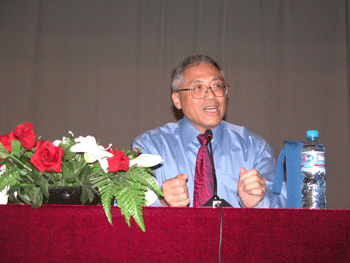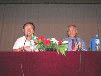 刘俊副校长(左)代表全体师生欢迎马鼎盛先生 马鼎盛先生在做报告
