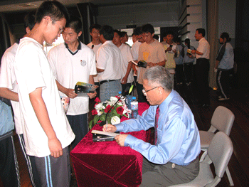 同学们积极踊跃地向马先生请教军事问题 马鼎盛先生为同学们签名送书