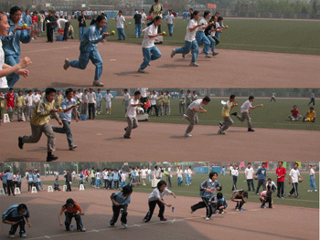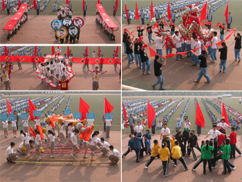 入场式上,各班运动员方队在行进到主席台前时,停留1分钟,表演各自精心设计编排的艺术队形和小品节目等,既新奇又具有创造性,充分体现了体育和艺术的巧妙结合,展现了同学们在体育、绘画、艺术等方面的才艺和创新能力。全场师生和来宾都为同学们的精彩表演热烈鼓掌。开幕式后,举行了广播操比赛以及托球跑、钓鱼跑、迎面接力、踢毽子、跳绳、投篮、足球颠球等趣味体育项目的比赛。