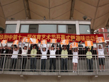 在学生比赛项目全部结束后,为增加乐趣,附中工会组织了一场教职工拔河比赛,同学们热情的为他们欢呼,场面热烈、壮观。闭幕式上,表彰了在入场式、广播操、文明观众、比赛等方面评出的集体奖,并由校领导为获奖班级颁发奖状。