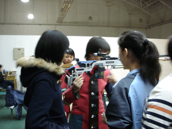 射击馆工作人员向师生们介绍射击馆情况 射击运动员向学生们讲授射击技术