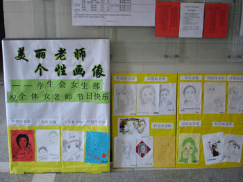 经过各班认真的工作“美丽老师个性画展”于三月八日展出。此项作品由各班同学执笔,画出给各班授课的女老师的画像,精彩纷呈,妙趣横生。美丽的女老师们经同学们多姿多彩的画笔后,或真实,或夸张,或精致,或风趣,展现了老师们在同学心中个性的一面。一块块展板,一张张画像,成为老师们心中最好的礼物。